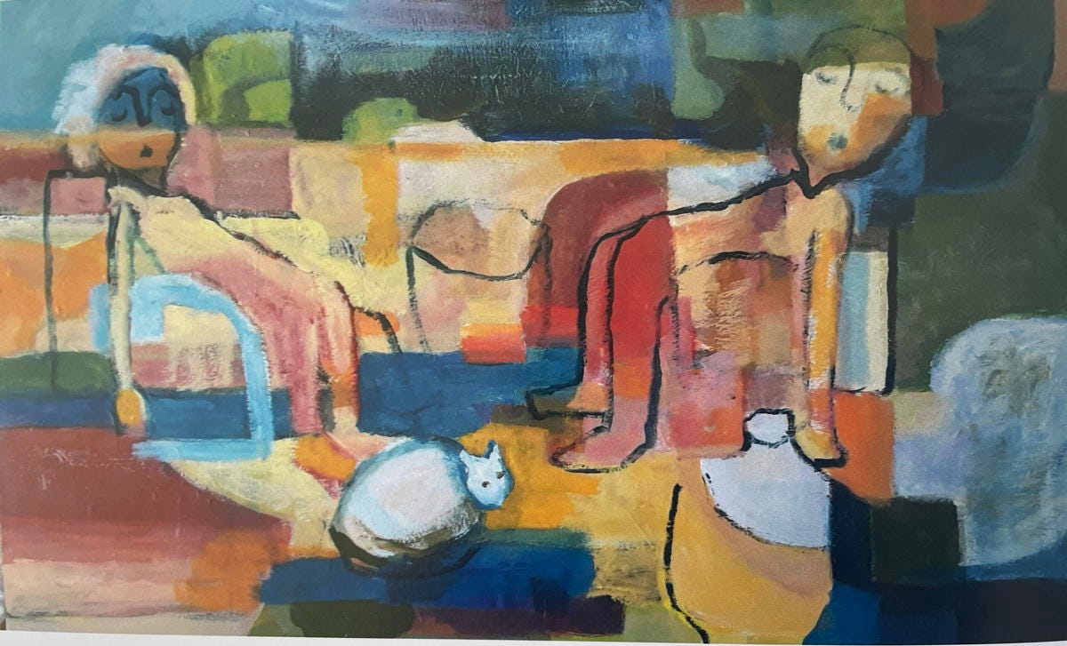 PS Exhausted Grandparents, the painting: if you’re a grandparent you sure know that feeling. The painting is by my sister, Lesley Evans. She’s pretty slack about publicising her new work but don’t worry, she is still painting away merrily in her 80s, in Christchurch, Aotearoa New Zealand. Shortly she and her husband Richard Evans will feature in my podcast, Learning How to Be Old, in an episode on gardening in later life.