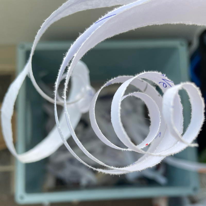 There’s always pleasure in physically shredding old bank statements, transcripts and manuscript drafts. My old hands can do this very satisfactorily. I like the whoofy sound of ripping paper. The vicious satisfaction of destroying. The righteous satisfaction of recycling. The housewifely satisfaction of a small daily task ticked off an imaginary list.
