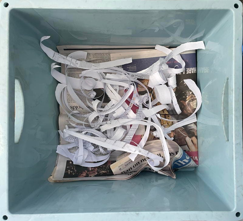My cat litter system is a masterpiece of efficiency, recycling of newspapers and secure shredding of confidential documents. (Not original, of course.) Newspaper to absorb the pee, shredded paper to give Ursula something to scratch and toss around.